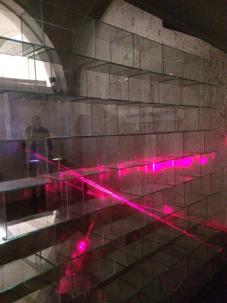 Una camera, venerdì scorso, era poi dedicata ad una delle famose installazioni con laser dell’artista. A partire dalla metà degli anni ’80, il laser diventa una costante nell’opera di Ada Costa, utilizzato quasi sempre in combinazione con specchi e vetro. Questo abbinamento riesce a comunicare in maniera convincente l’idea di spazio penetrato, conquistato, di superamento della consistenza fisica del corpo.